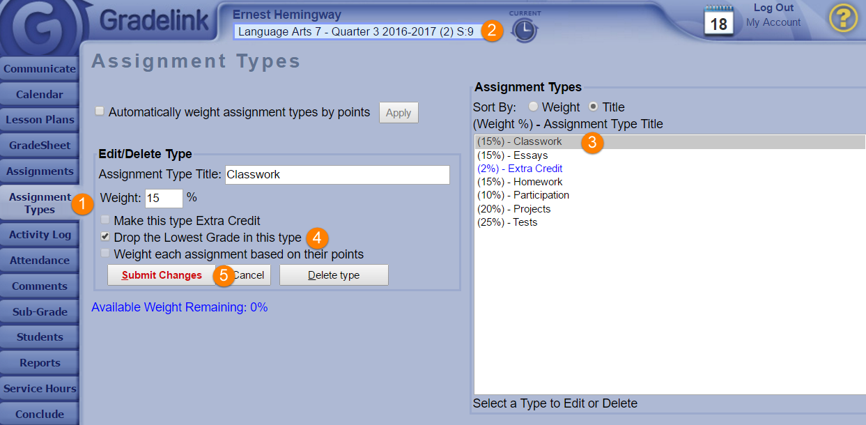 3. Click on the assignment type to drop lowest grade from the gradesheet.