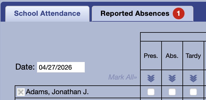 Absent reports will appear in the Admin/Teacher login under Attendance > Reported Absences. This page section allows quick and easy marking of attendance which can be automatically included in normal attendance tracking.