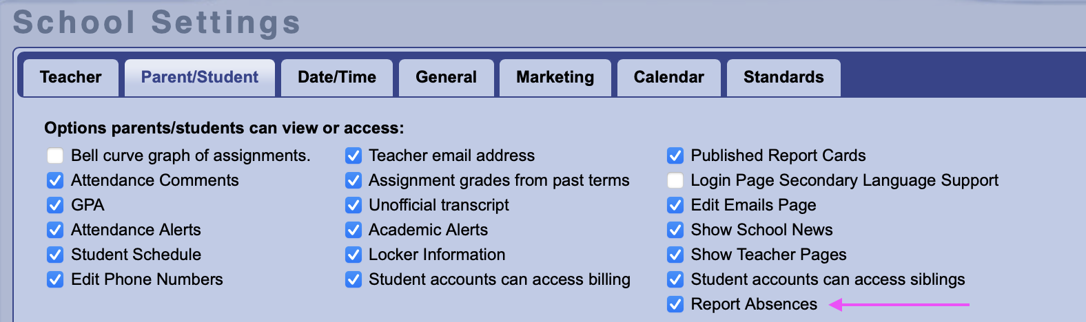To enable, turn on Settings > Parent/Student > Report Absences