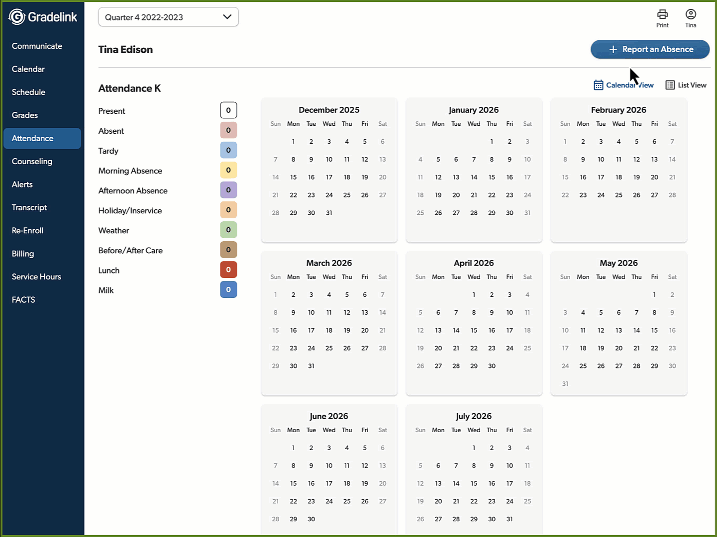 Absence Reporting in Gradelink gives parents an easy way to report absences from their web login or mobile app. Administrators can get notifications, and for schools that track Daily Attendance, a subsection in the Attendance page will appear allowing quick and easy confirmation and application of appropriate attendance values, even months ahead such as for family vacations.